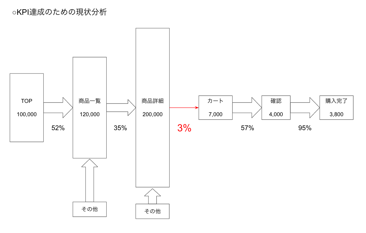 各ステップにおける数値を落とし込んでいき、ボトルネックとなっている点を抽出し、改善案を検討していきます。